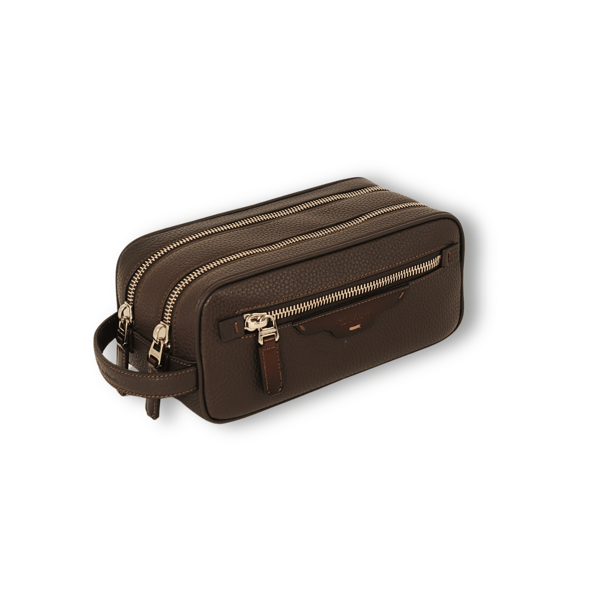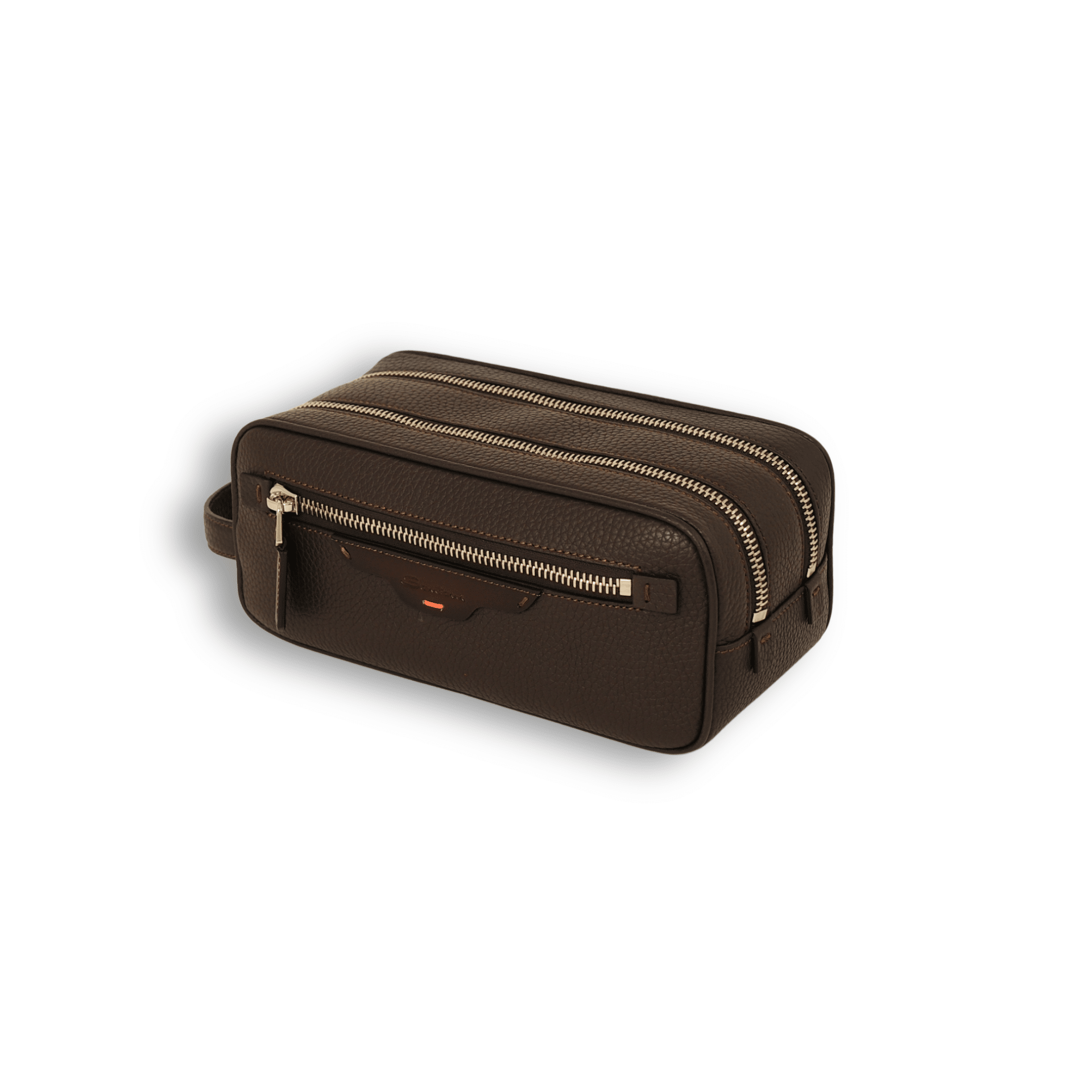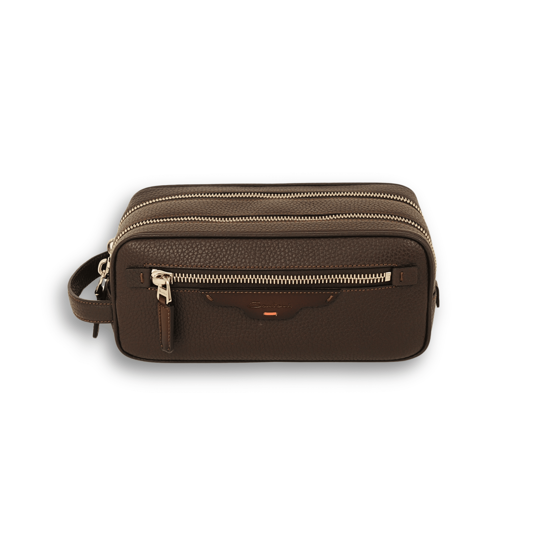 This elegant, essential Santoni beautycase is crafted from a refined combination of tumbled and smooth leather, the latter featuring Maison’s signature “velatura” finish. Two interior compartments and a front zip pocket make it easy to keep all your cosmetics organized. The bag also features a side handle for hanging.