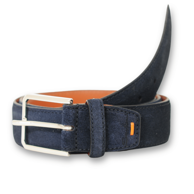 Suede Santoni belt in dark blue color. The belt has a color gradient, the middle part is a slightly lighter blue, and the beginning and end are dark blue.